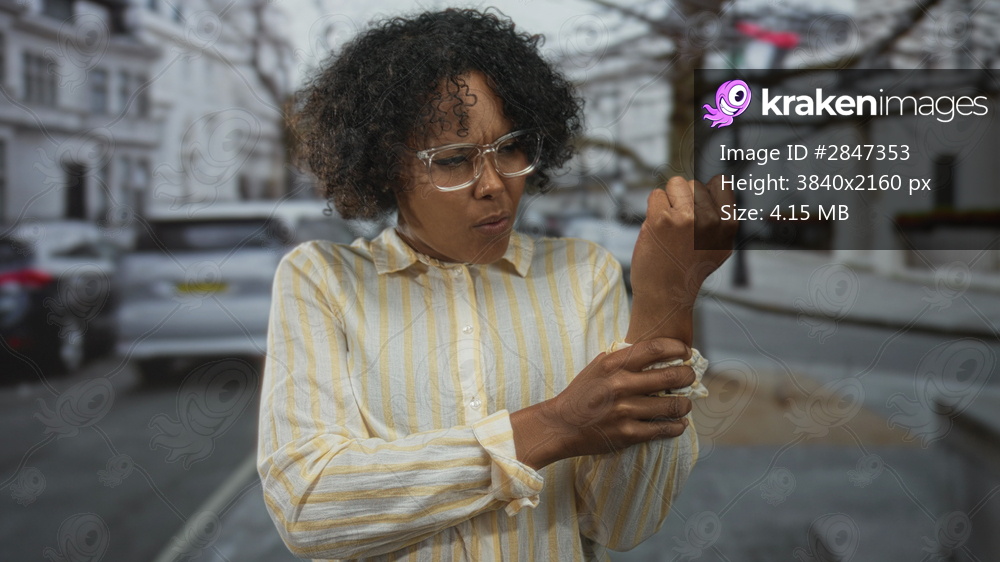 Woman rubs her bare forearm beside parked cars on a quiet city street, examining an irritated patch on her wrist; frustration.