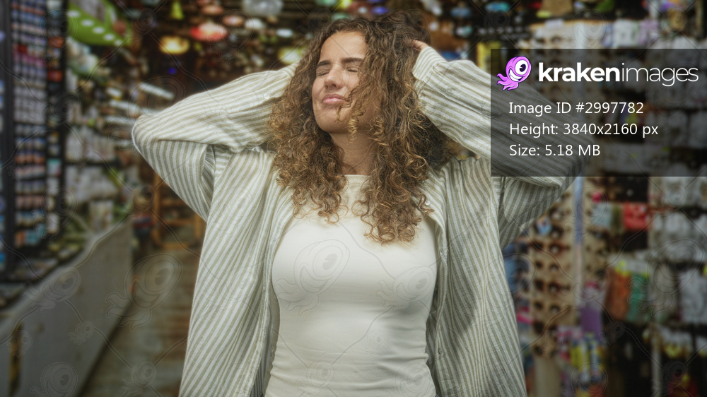 Woman runs hands through curly hair, tousling strands and pressing fingers to scalp while making a pained grin in building aisle; frustration release.