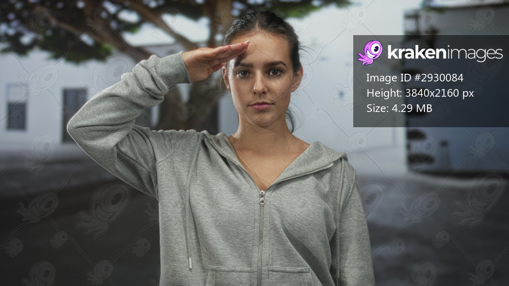 Woman salutes with hand to forehead showing face and neck in front of building wearing grey zip hoodie; respect dedication.