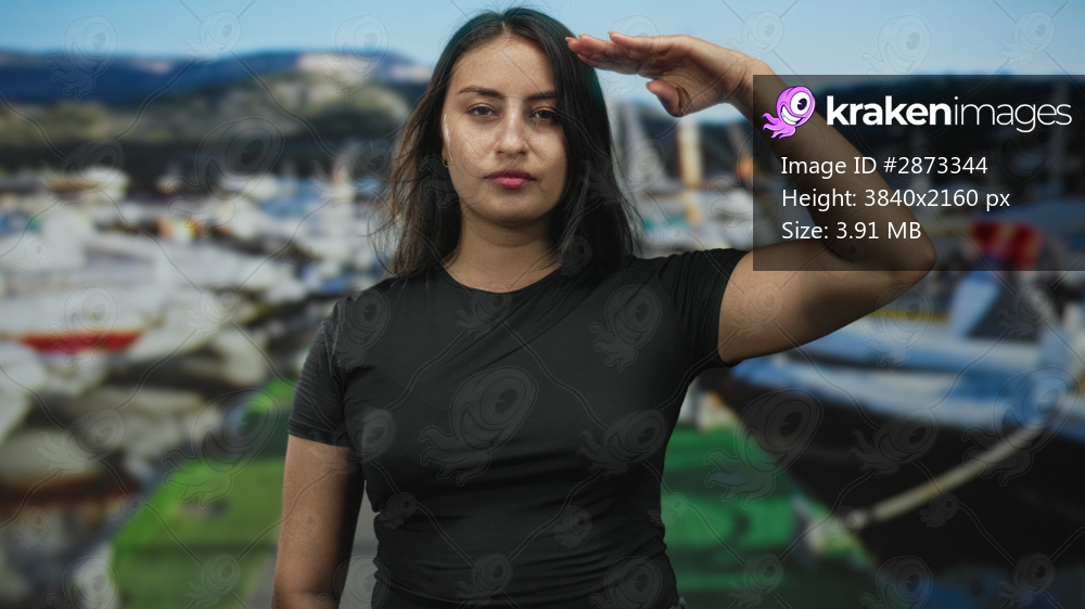 Woman salutes with hand to forehead and visible arm in studio marina by boats and dock; calm determination.