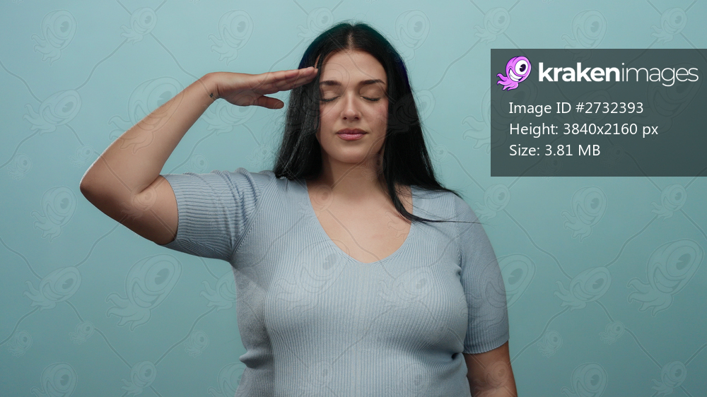 Woman saluting against an isolated blue background showcasing confidence and style with her plus size curvy figure.