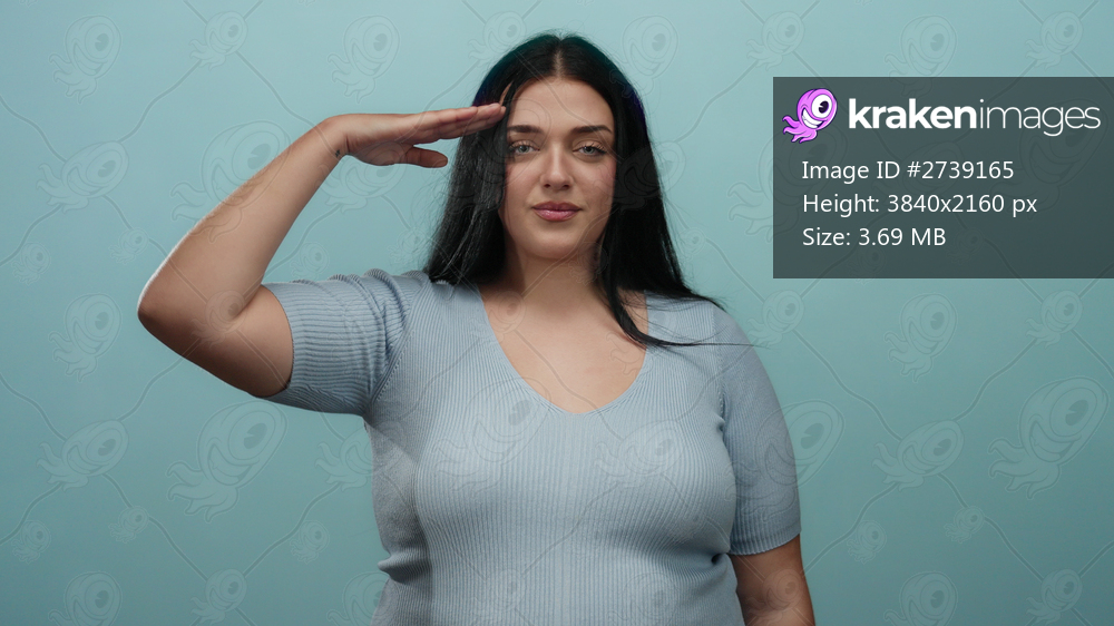Woman saluting against an isolated blue background showcasing confidence and style with her plus size curvy figure.