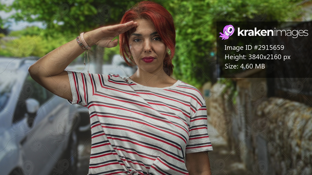 Woman saluting with hand to forehead on a leafy residential street by parked cars and stone wall, wearing striped shirt; pride determination.