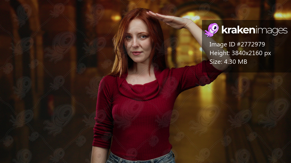 Woman saluting in church with red hair wearing burgundy sweater conveying beauty and confidence under warm lighting creating an inviting atmosphere inside the elegant building - Kraken Images