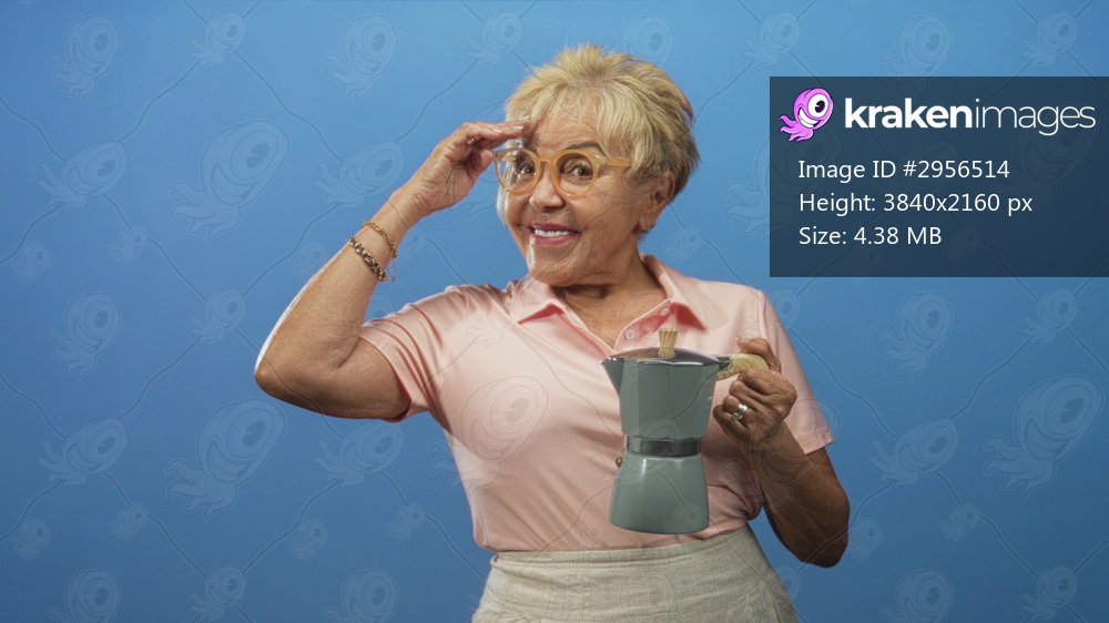 Woman saluting while holding a stovetop coffeemaker and smiling against a blue studio backdrop, wearing glasses and a pink polo; cheerful nostalgia.