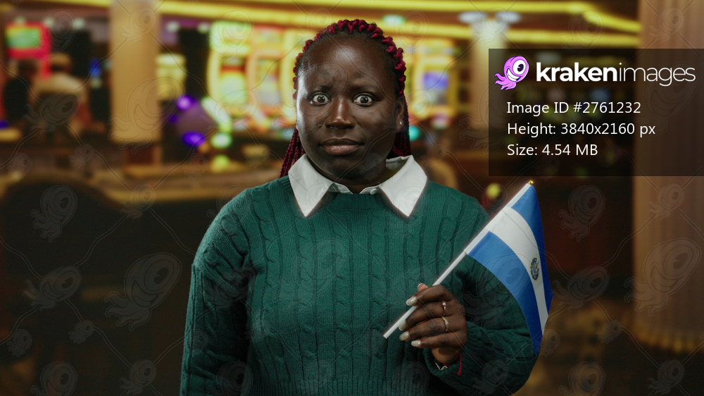 Woman with salvadoran flag in casino setting surrounded by vibrant slot machines reflecting cultural diversity
