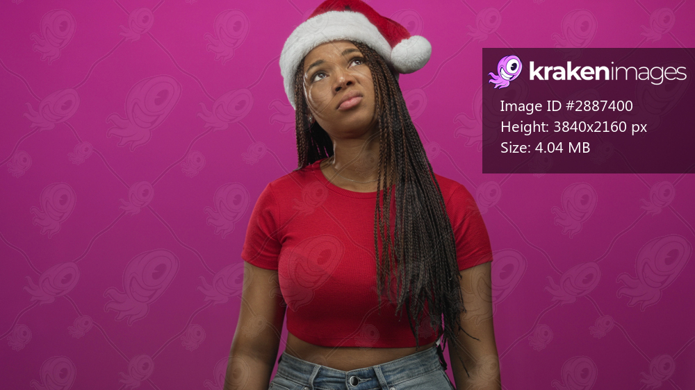 Woman with santa hat touching face with hand and grimace wearing cropped red top in pink studio; annoyance holiday.