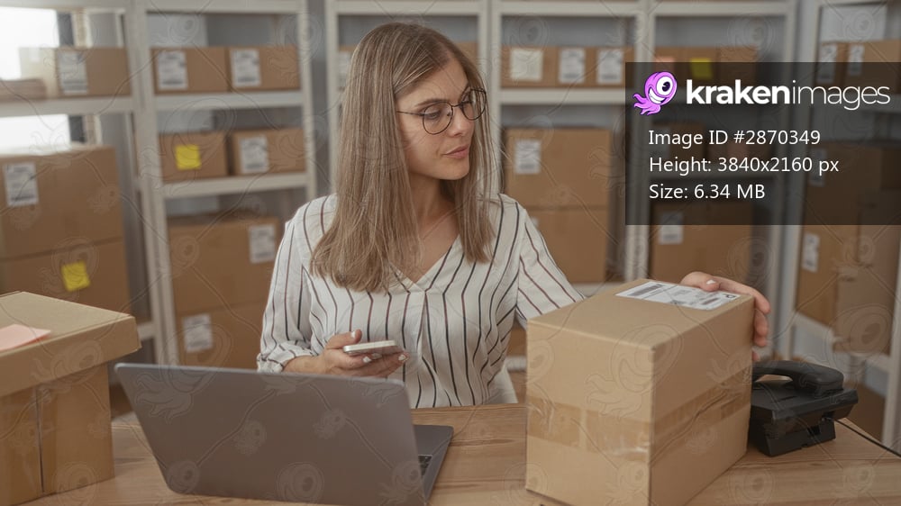 Woman scans cardboard package barcode with smartphone and checks laptop screen in building; efficiency.