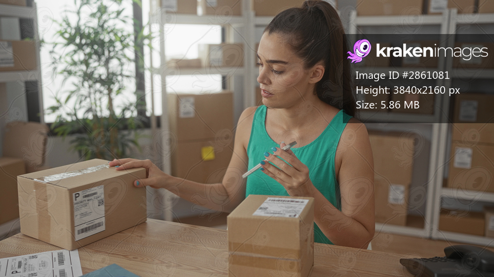Woman scans package label with smartphone in building filled with stacked cardboard boxes on shelves; efficiency organization productivity focus.