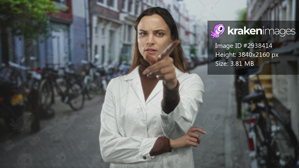 Woman scientist with finger to lips for silence on street wearing white lab coat and turtleneck, pensive gesture; quiet contemplation.