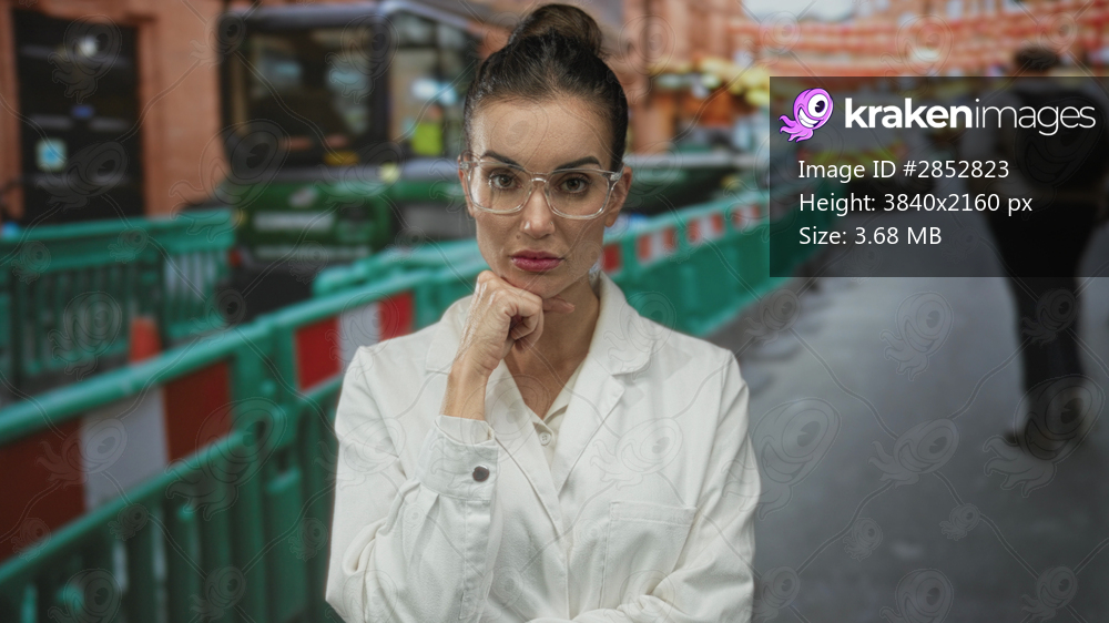 Woman scientist with hand on chin on street near green barricade and passing van, wearing labcoat and clear glasses looking down; thoughtful reflection. - Kraken Images