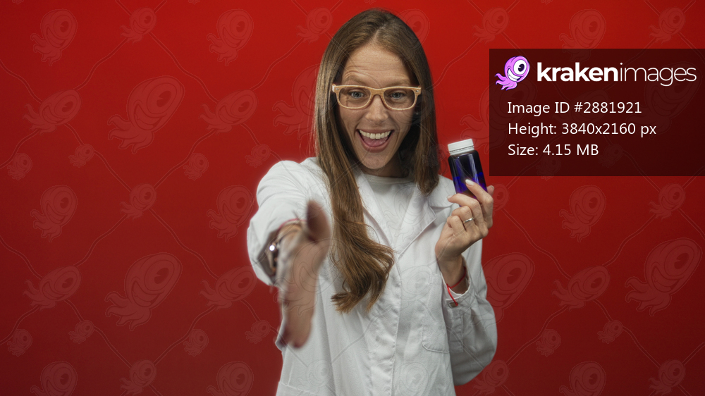 Woman scientist holding blue bottle and extending hand for handshake in red studio; trust outreach wellness.