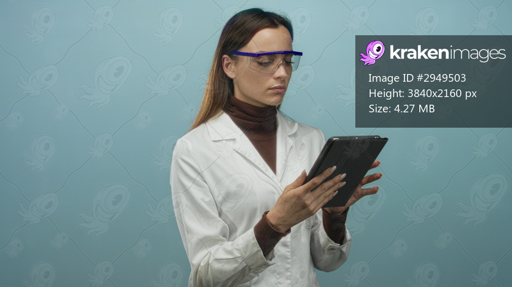 Woman scientist holding tablet and wearing safety goggles in studio with teal backdrop; concentration professionalism.