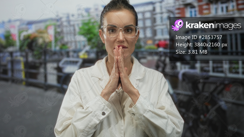 Woman scientist in lab coat hands clasped in thoughtful pose on modern street by canal; quiet contemplation.