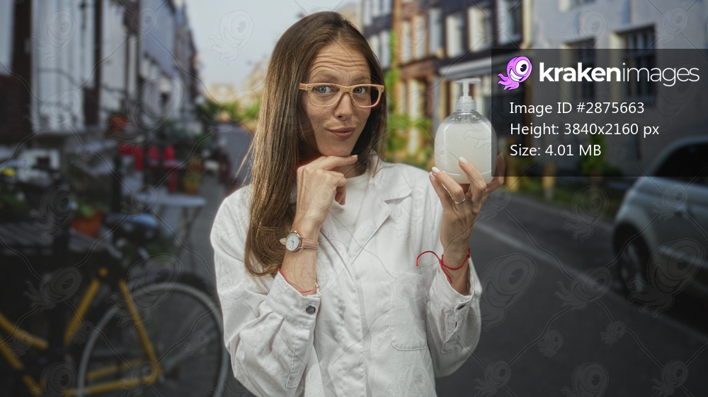 Woman scientist in lab coat holding soap dispenser with finger to chin on street; hygiene awareness confident.