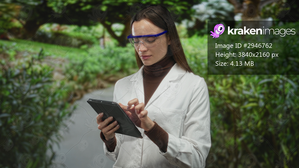 Woman scientist in lab coat wearing safety goggles taps tablet with fingers on park path; concentration field research.