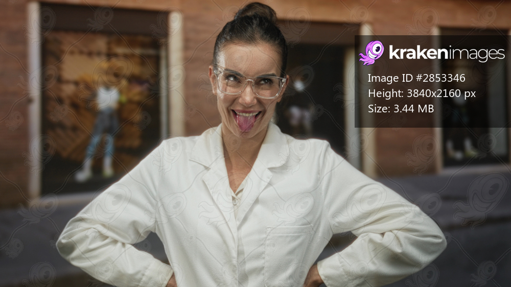 Woman scientist in lab coat wears glasses and stands hands on hips on street with brick building facade; confidence innovation.