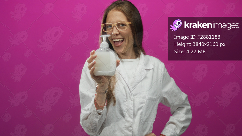 Woman scientist in white lab coat holding a soap dispenser in her hand and smiling in pink studio; hygiene promotion cheerful.