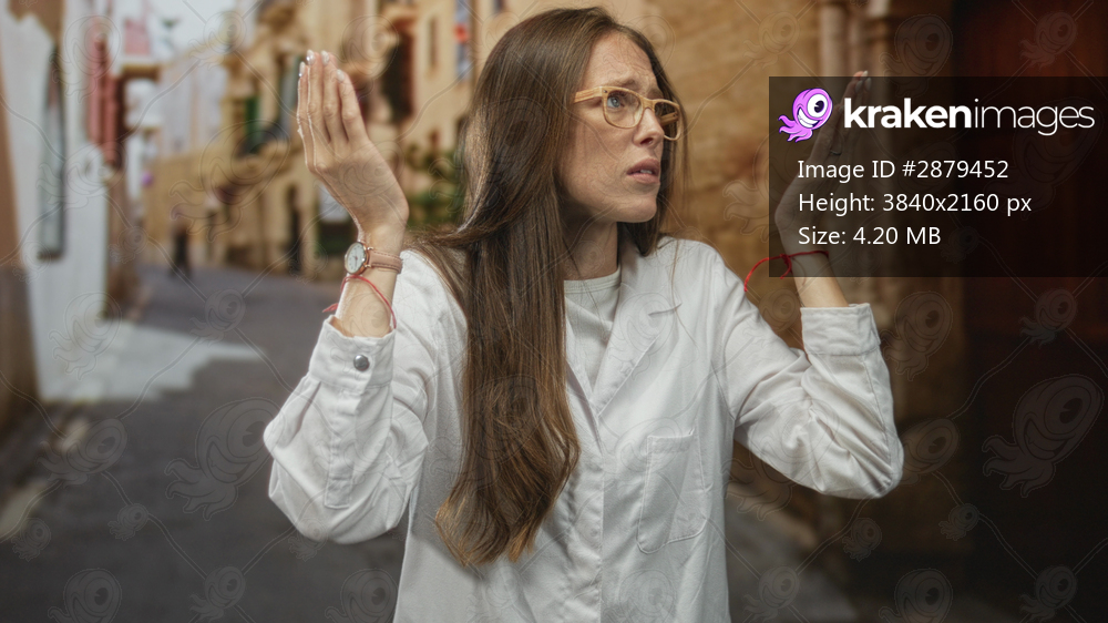 Woman scientist in white lab coat holding hands to forehead on a narrow street in a city; anxiety exhaustion.