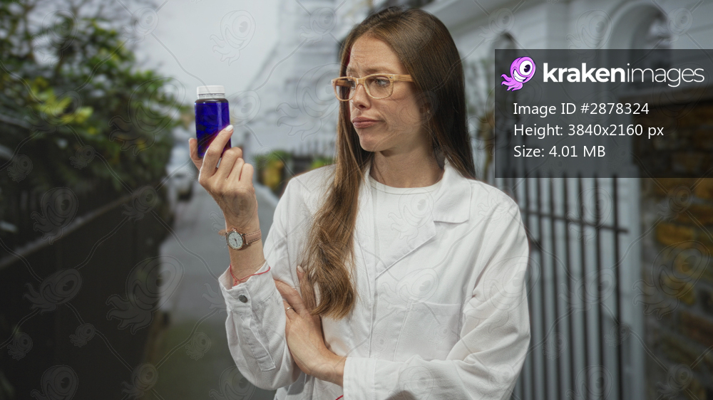 Woman scientist in white lab coat holds a cobalt blue vial up on city street inspecting the label with folded arms and raised eyebrow; skepticism.
