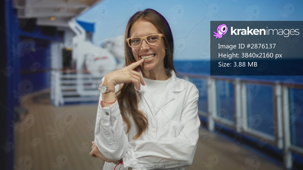 Woman scientist in white lab coat touching finger to teeth and smiling on a cruise ship deck building; playful joy.