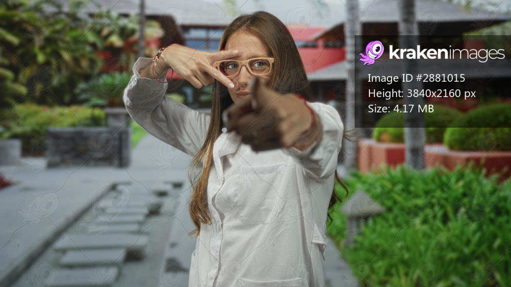 Woman scientist points finger at camera and shows peace sign in building courtyard near green plants; playful confidence.