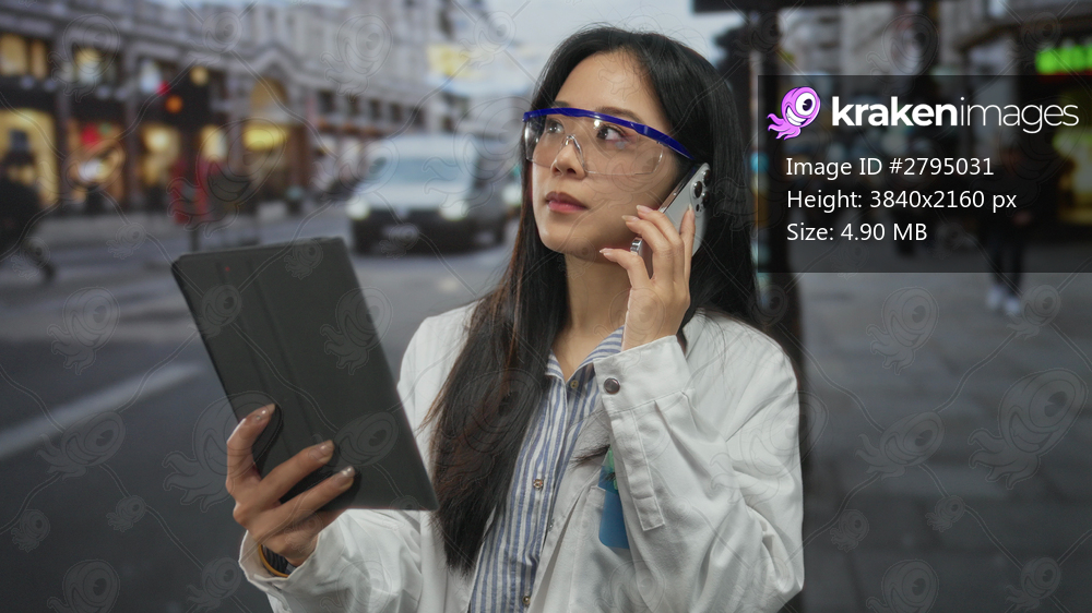 Woman scientist using tablet and phone outdoors on busy urban street, wearing safety goggles and white coat, exemplifying multitasking and technology in public. - Kraken Images