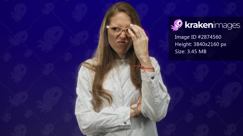 Woman scientist wearing lab coat and glasses with arms crossed in purple studio; frustration determination resilience.