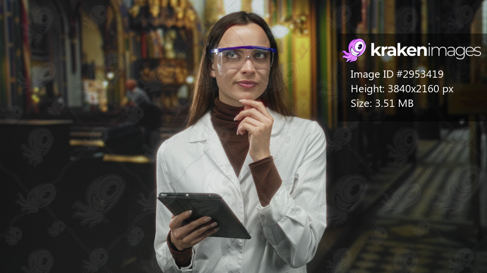 Woman scientist wearing lab coat and safety goggles tapping tablet inside a church building; curiosity faith.