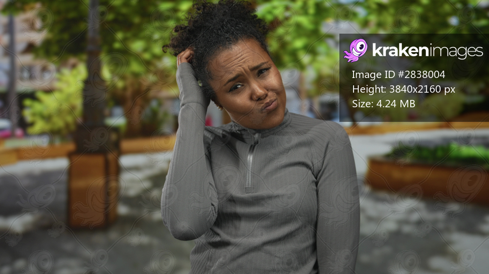 Woman scratches head on a leafy street near wooden benches and green trees in a puzzled gesture under midday light; uncertainty.