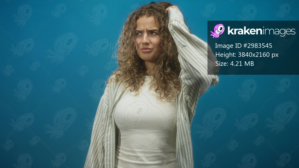 Woman scratching head with hand while wearing striped cardigan and white tanktop against blue studio backdrop; uncertainty thought.