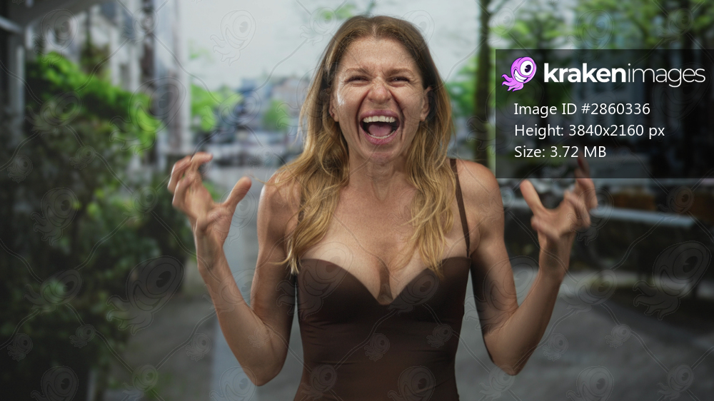Woman screaming with hands clawing and cleavage visible on a city street lined with bicycles and planters, leaning forward; anger.