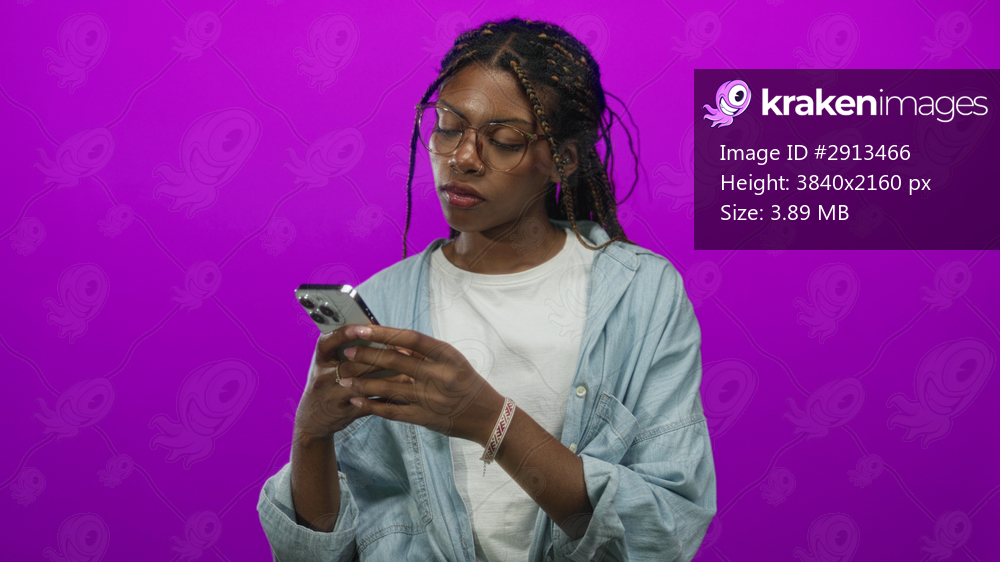 Woman scrolling smartphone with hands visible and eyeglasses, wearing denim shirt in magenta studio under soft lighting; concentration engagement.