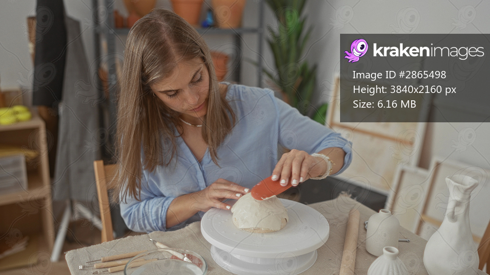 Woman sculpting white clay on a pottery wheel with hands in a sunlit studio; creative focus and craftsmanship.