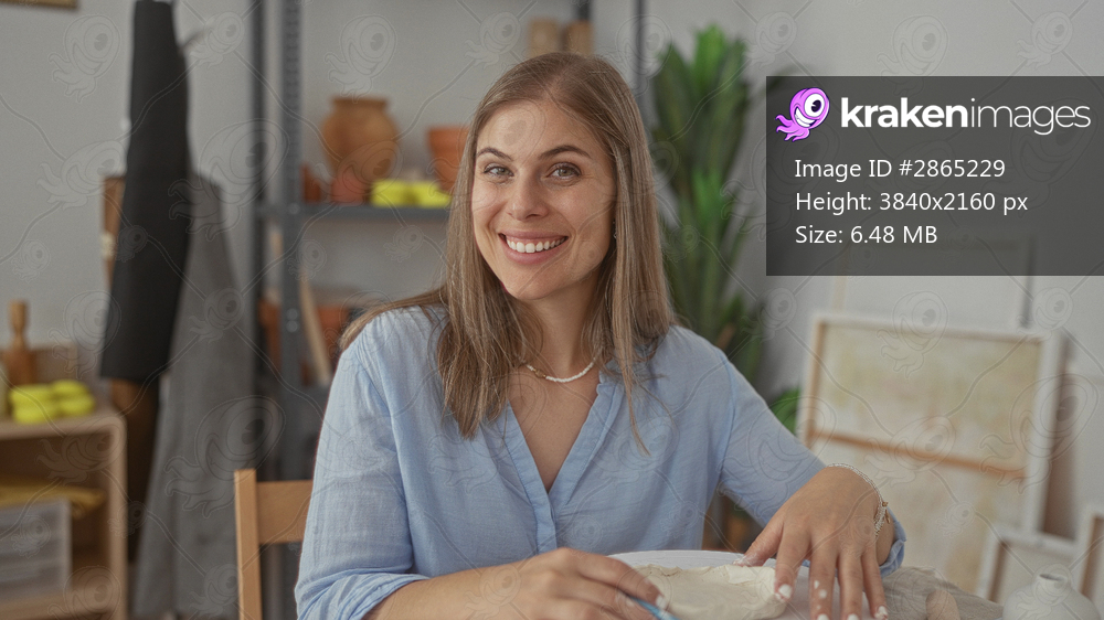 Woman sculpts a clay bowl with her hands in a pottery studio filled with shelves of vases and tools; serenity creativity craftsmanship.