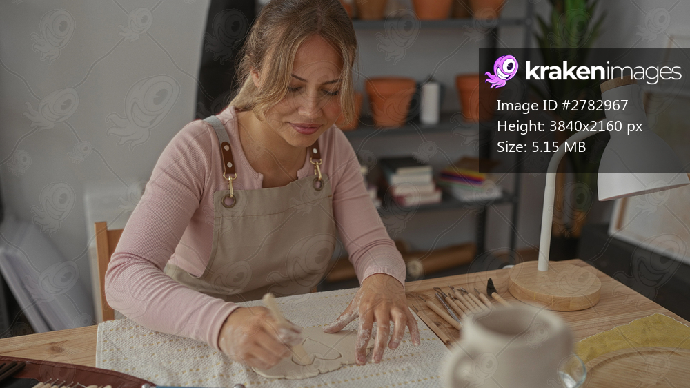 Woman sculpts clay with her hands on a wooden table in a pottery studio while wearing an apron and surrounded by shelves of pots and tools; creativity concentration artistry focus. - Kraken Images