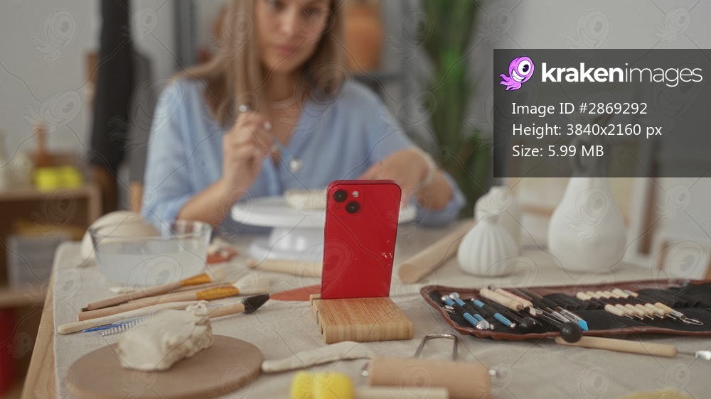 Woman sculpts clay with tool in artisan studio surrounded by pottery brushes and wheel on table; concentration.