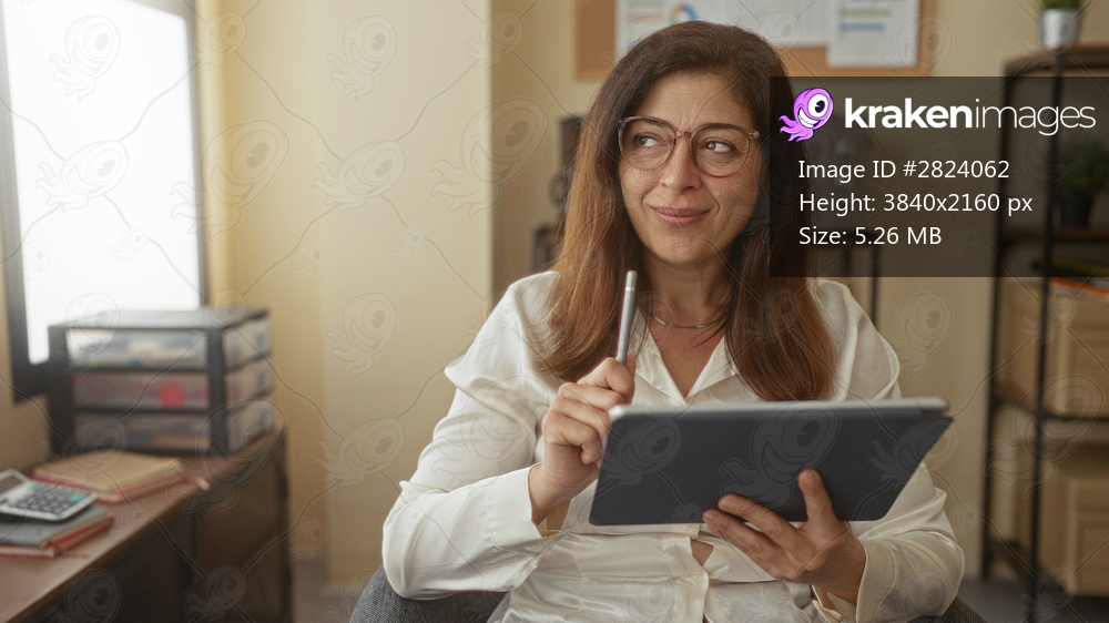 Woman seated smiling holds digital tablet and taps touchscreen with stylus pen in building; focused productive work.
