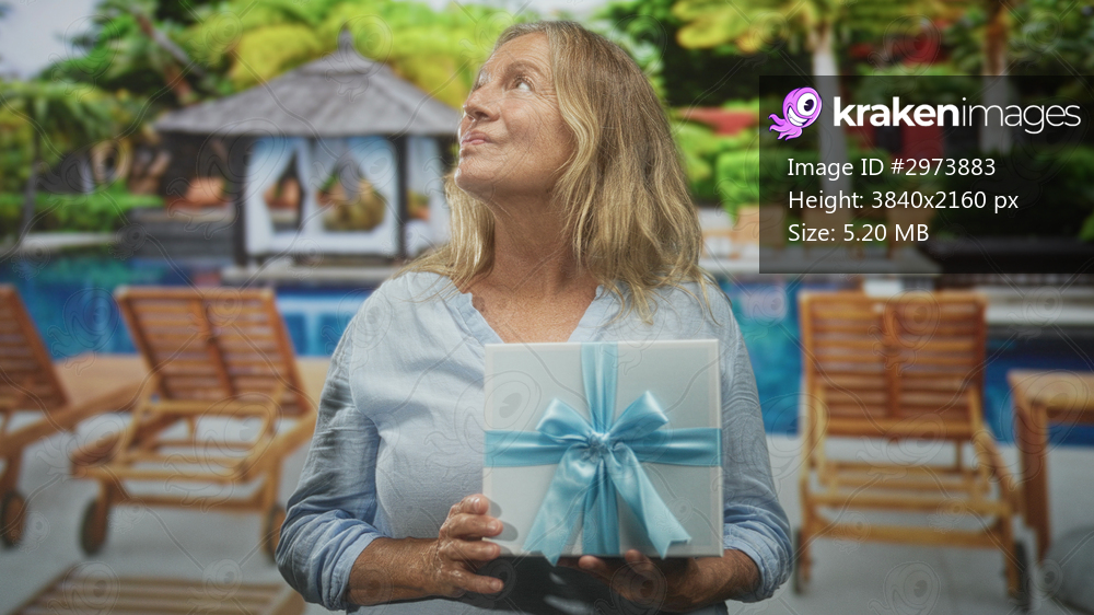 Woman senior blonde holding white gift box with blue ribbon, hands visible, posed in studio with poolside cabana and lounge chairs backdrop; sharing celebration contentment. - Kraken Images