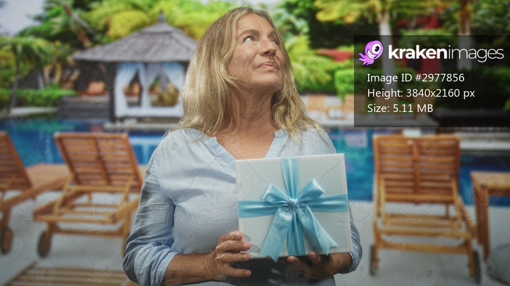 Woman senior blonde holding white gift box with blue ribbon, hands visible, posed in studio with poolside cabana and lounge chairs backdrop; sharing celebration contentment. - Kraken Images