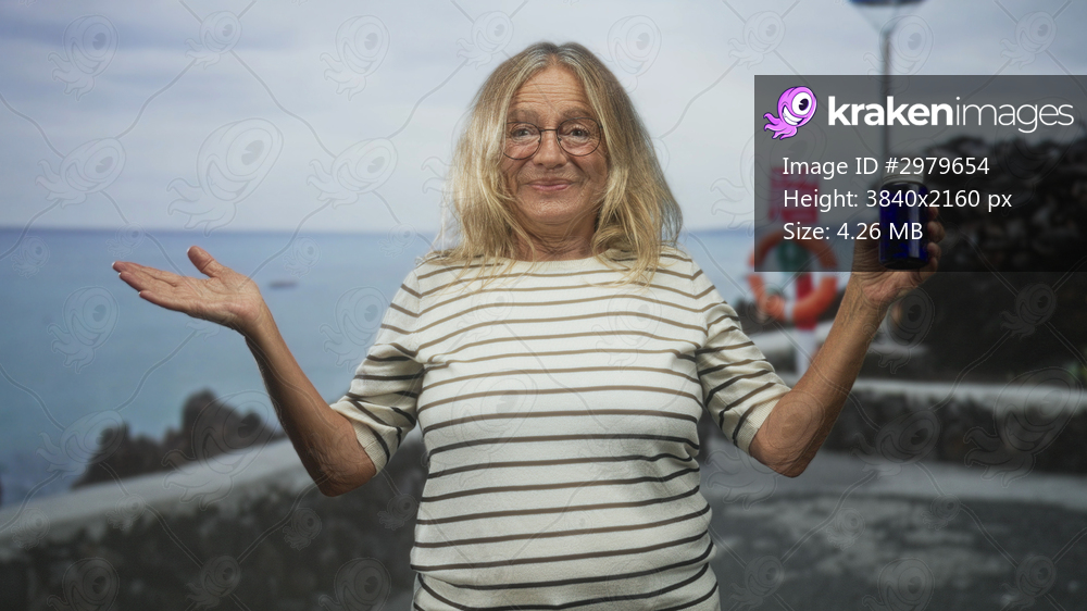 Woman senior blonde in striped shirt holding blue pill bottle in right hand and shrugging with open left palm in studio seascape backdrop; uncertainty. - Kraken Images