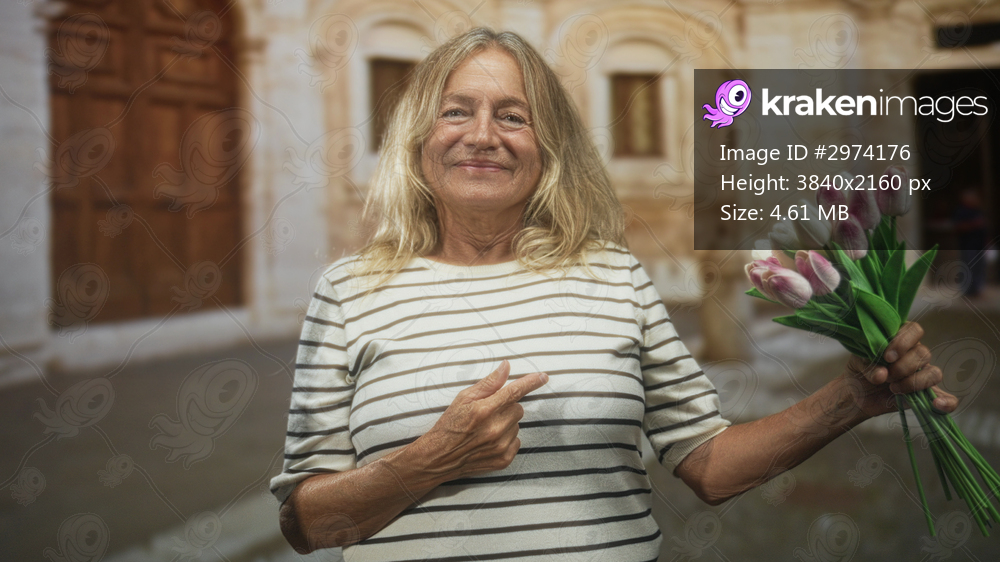 Woman senior blonde points finger to bouquet of tulips and places hand on chest in front of building archway; contentment gratitude.