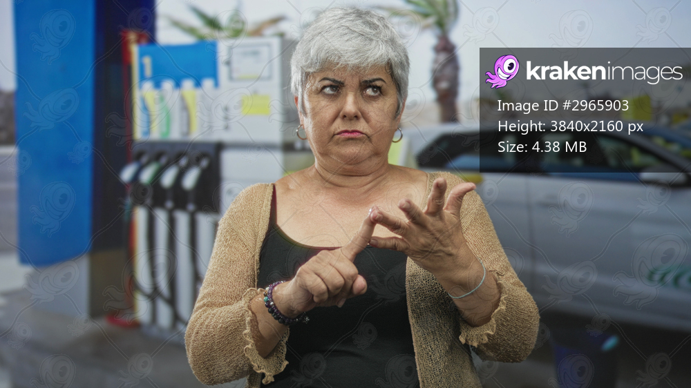 Woman senior grey hair counting fingers at fuel pump beside parked car on street, tapping and pointing to digits while checking fuel cost; concern.