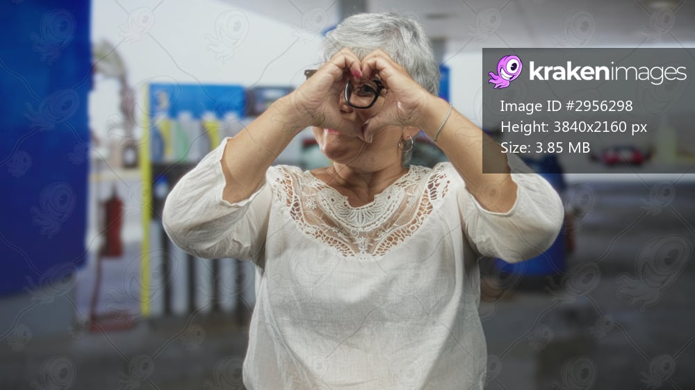 Woman senior with grey hair and glasses forming a heart with hands in front of gas pump and car at a street fuel station wearing white blouse, smiling; playful affection. - Kraken Images