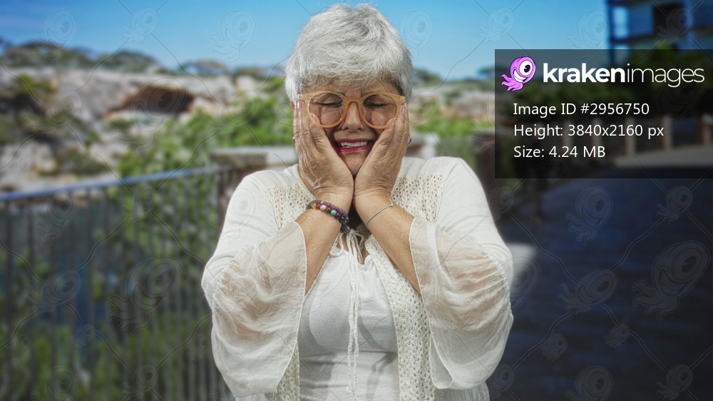 Woman senior with grey hair and glasses holding cheeks for toothache while wearing white blouse and bracelets on a street by a railing and cliffs; pain. - Kraken Images