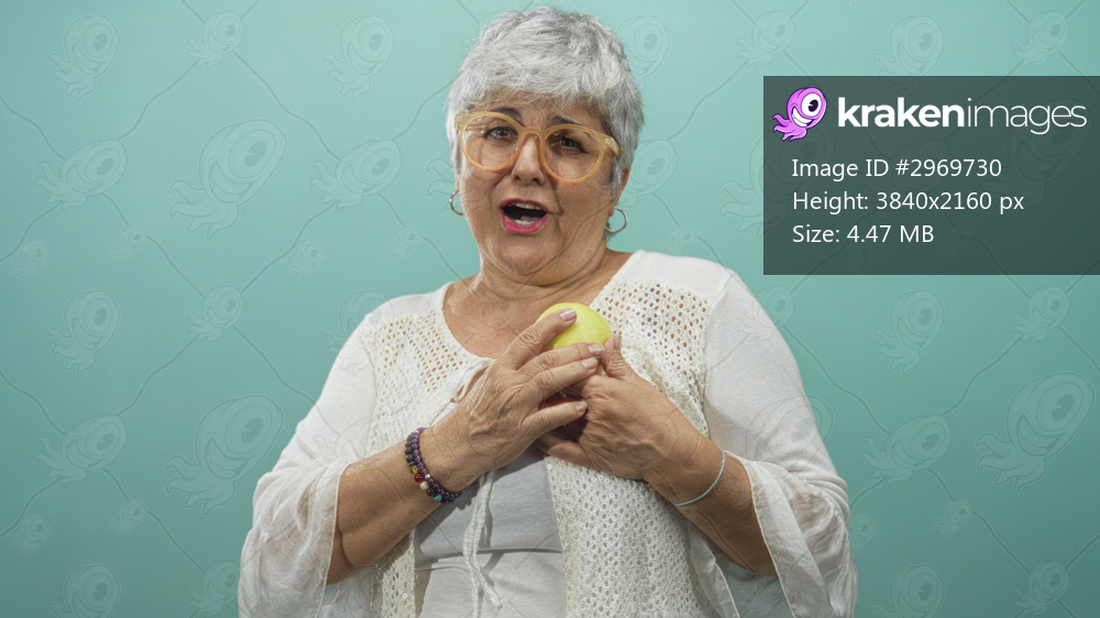 Woman, senior with grey hair and glasses, holding and examining a green apple with both hands in a studio teal backdrop; gentle curiosity.