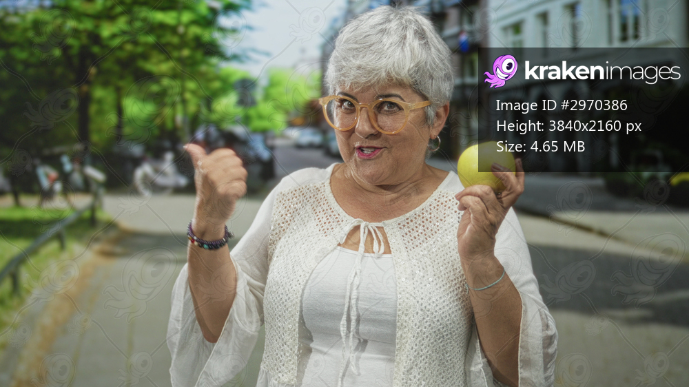 Woman senior with grey hair and glasses holding green apple in hand, smiling and giving thumbs up while standing on street; healthy happiness.