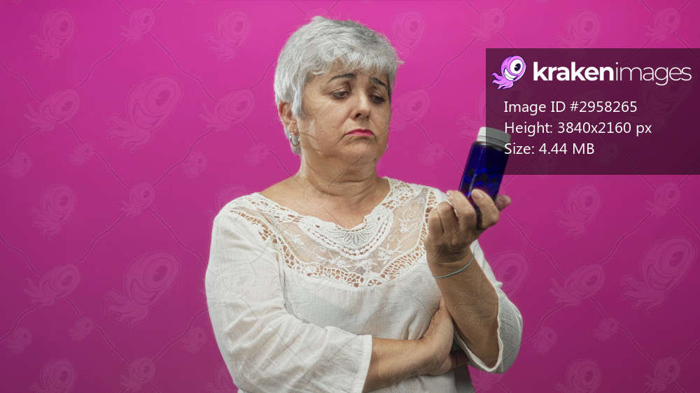 Woman senior grey hair holding blue pill bottle, hand raised inspecting white cap and label, arms crossed, wearing white blouse in studio; concern caution. - Kraken Images