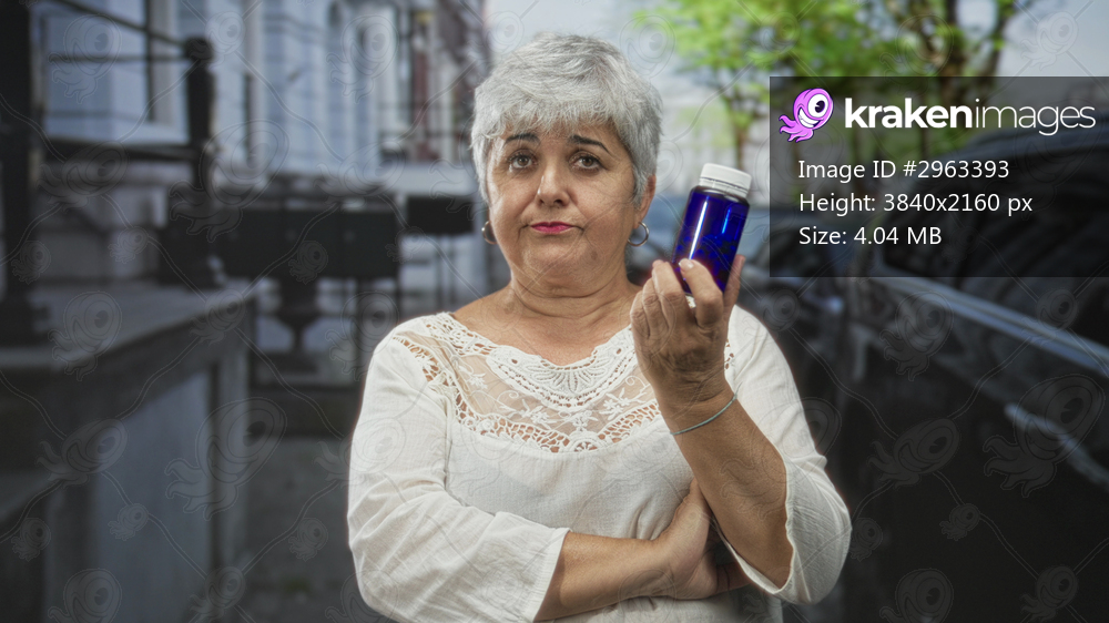 Woman senior with grey hair holding blue pill bottle to chest, crossed arms and skeptical frown on street; health concern decision.