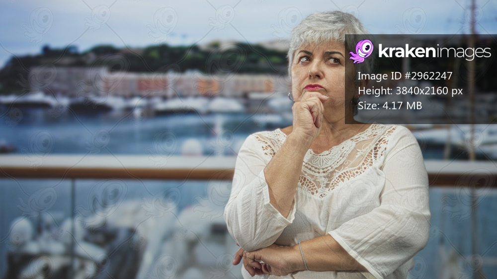 Woman senior with grey hair, plus size, folded arms and hand on shoulder, wearing lace blouse on marina railing with yachts visible, pensive look; quiet contemplation. - Kraken Images